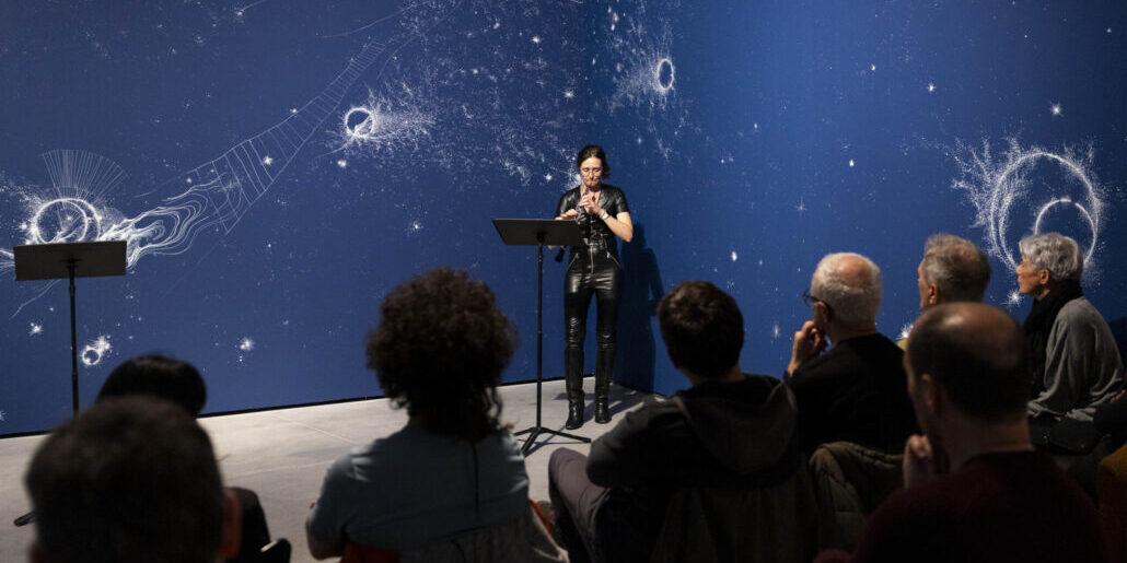 As in Oriki a Oló-Okún, the pictorial backdrop seen during the performance of Kalam—the installation La Noche (2025)—proved ideal, for in it we see staircases and spirals that seem to unravel the partials extracted from the oboe along its chains of harmonics, image becoming sound, though with a slightly greater roughness compared to the mural’s ethereal clarity. Time is another crucial dimension in Kalam, in the way Fontalba inhabits and dissects it with her successive changes of speed when presenting the multiphonics, stretching her cycles so that different resonances remain suspended in the air, like notes encountered in those eternal silences of infinite spaces that so terrified Pascal.
